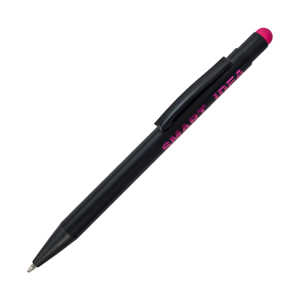 Długopis z czarnym korpusem i kolorową końcówką do ekranów dotykowych. Możliwość wykonana błyszczącego logo w kolorze nawiązującym do koloru końcówki. Niebieski wkład.