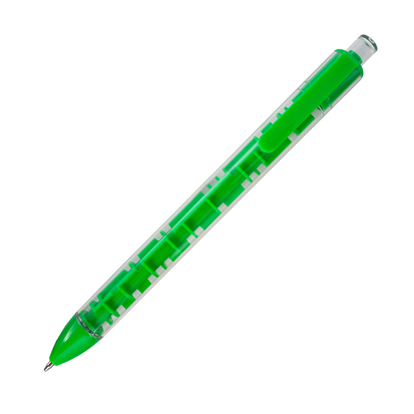 Oryginalny długopis z przezroczystym korpusem i wbudowanym labiryntem. Wkład w kolorze niebieskim.