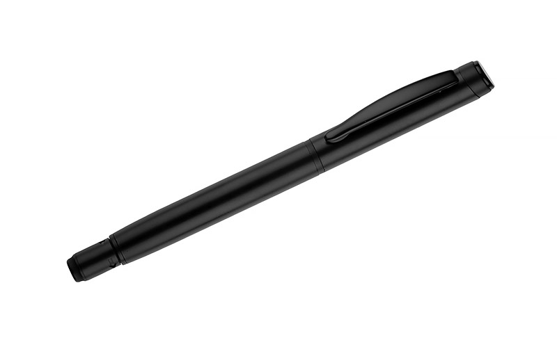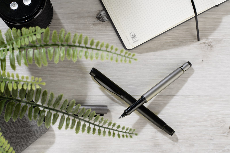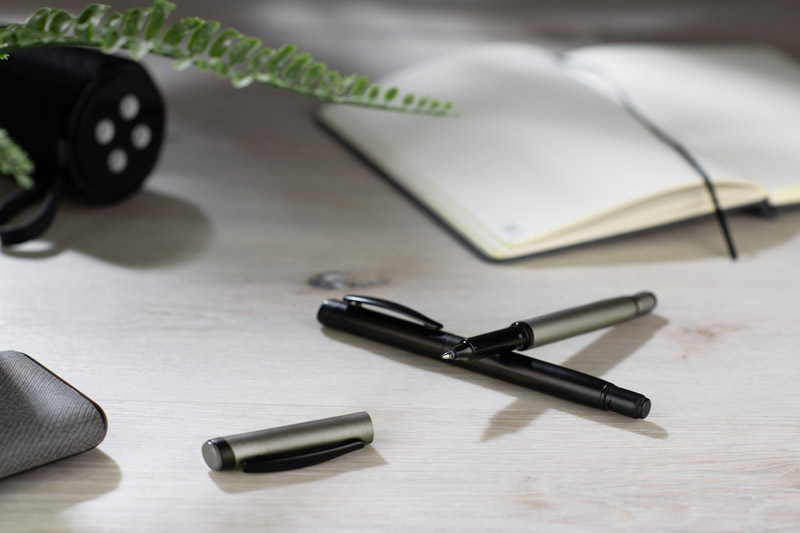 Długopis ROTIS to aluminiowy model z żelowym wkładem typu free ink, zamykany klasyczną zatyczką. Korpus o półmatowym wykończeniu uzupełnia czarny, metalowy klips, który dodaje elegancji. Obrotowa końcówka z wbudowanym spinnerem pełni funkcję antystresową – umieszczona na niej czarna strzałka, wytłoczona w materiale, subtelnie sugeruje kierunek obrotu.