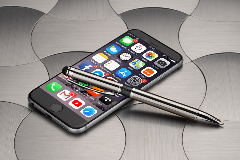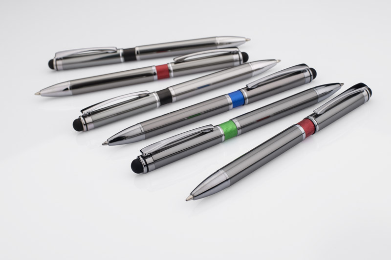 Elegancki metalowy długopis z kolorową aplikacją na korpusie oraz touchpenem.